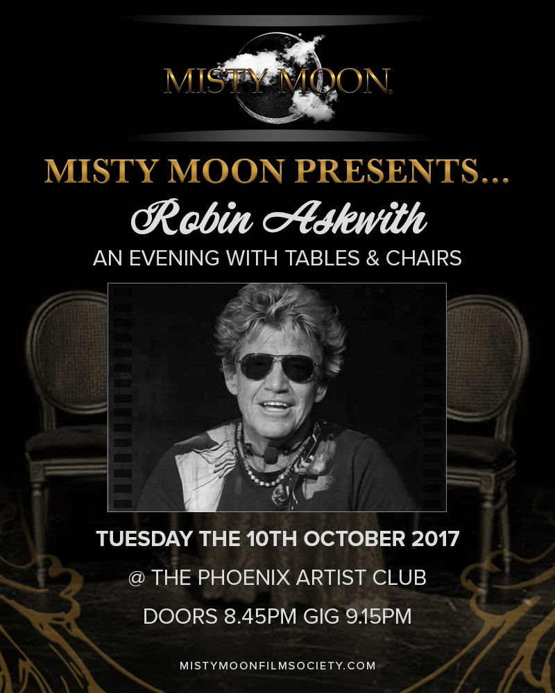 After his sell out mini UK tour earlier this year, the force of nature that is Robin Askwith is BACK at The Phoenix Artist Club on Tuesday the 10th October 2017 for a gig showcasing his 50 year career. Doors 8.45pm Gig: 9.15pm Limited tickets available on the door or in advance from https://www.eventbrite.co.uk/e/misty-moon-presents-robin-askwith-an-evening-withtables-and-chairs-tickets-37555751263